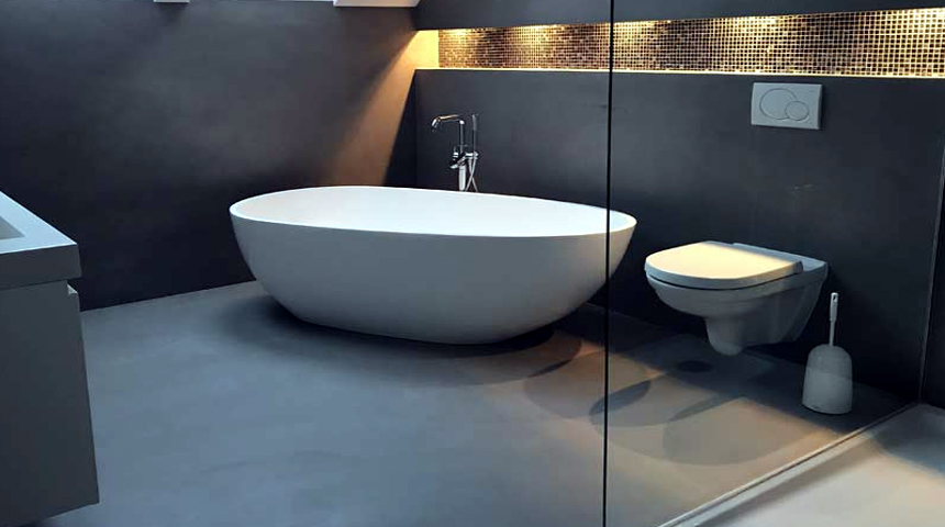 Die Bäder und WCs erhalten schwimmenden Estrich, auf Warmwasserfußbodenheizung mit mineralischer Spachtelabdichtung, z.B. System „Deitermann Superflex A“ o. glw.