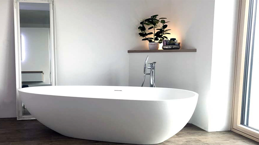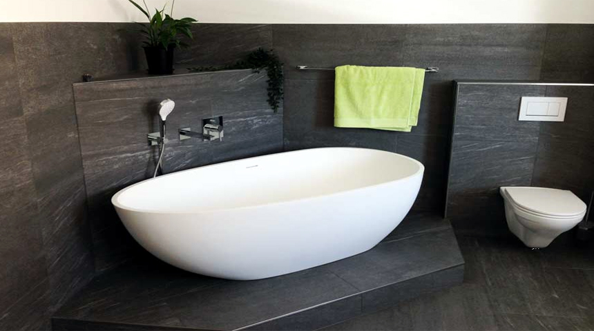 Die Wände der Bäder werden nach Badplanung mit hochwertigen Fliesen- Natursteinbelägen belegt.