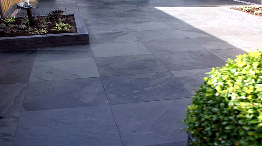 Die Wege im Außenbereich (nach Planung) erhalten einen steinernen Plattenbelag aus Natur- oder Betonwerkstein.