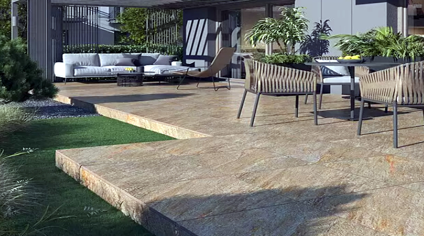 Die Loggien, Balkone, Dachterrassen und die Terrassen im Erdgeschoss erhalten Natursteinbelag.