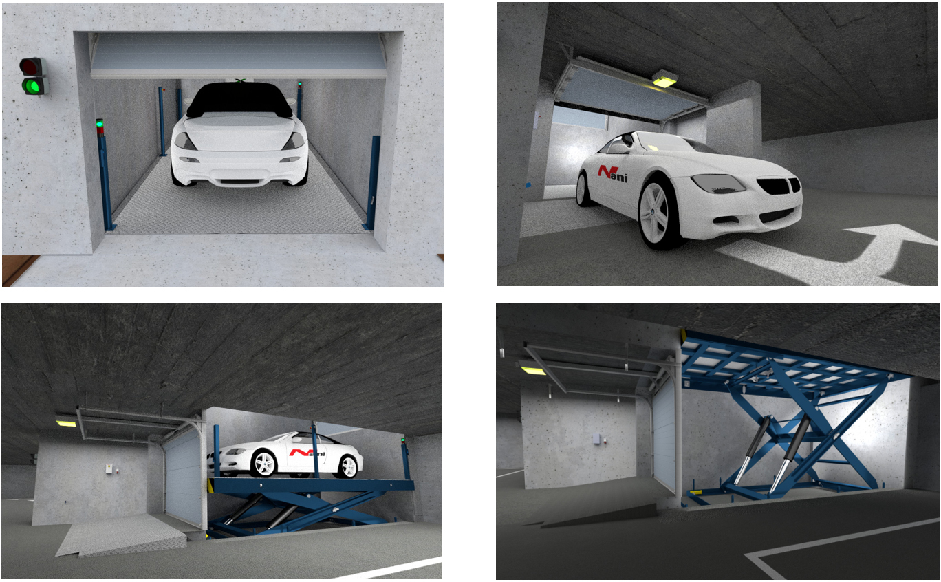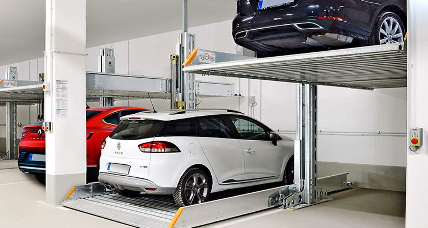 Der Fahrer fährt mit einem PKW in die Aufzugskabine ein, wird vom Aufzug vertikal auf die Parkebene befördert und kann