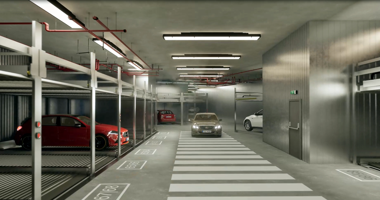 hier in Fahrtrichtung aus dem Aufzug ausfahren. Gesteuert wird der Parkvorgang des Ein- und Ausfahrens durch eine intuitive Nutzerführung.