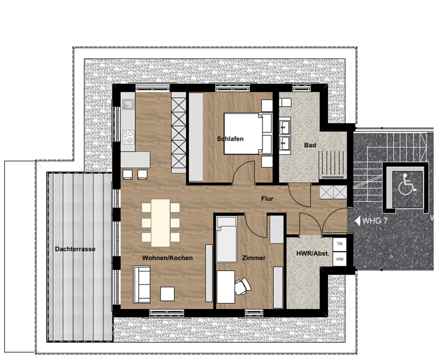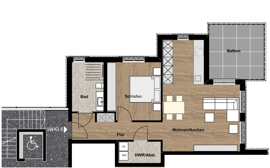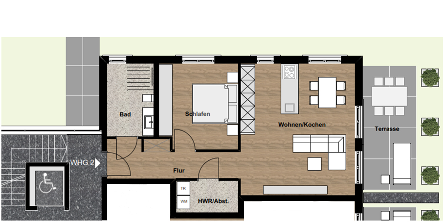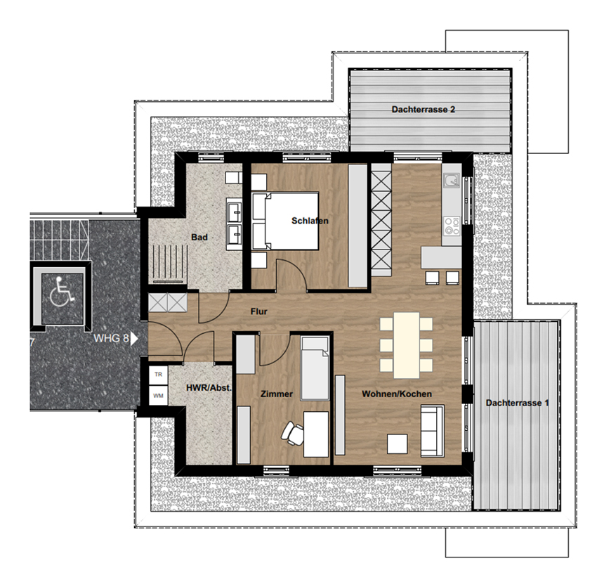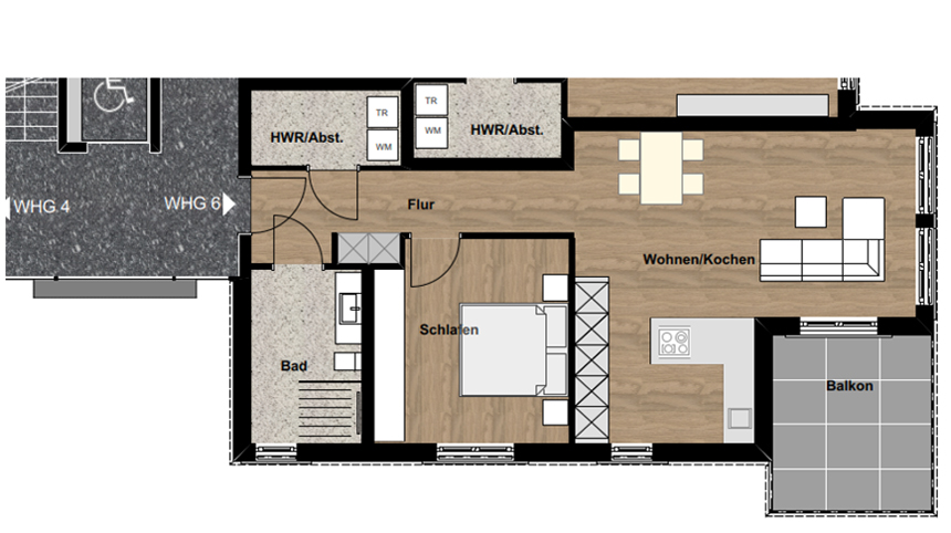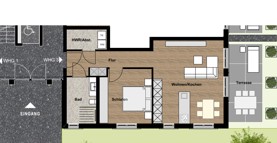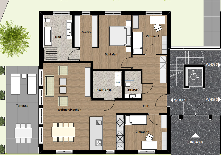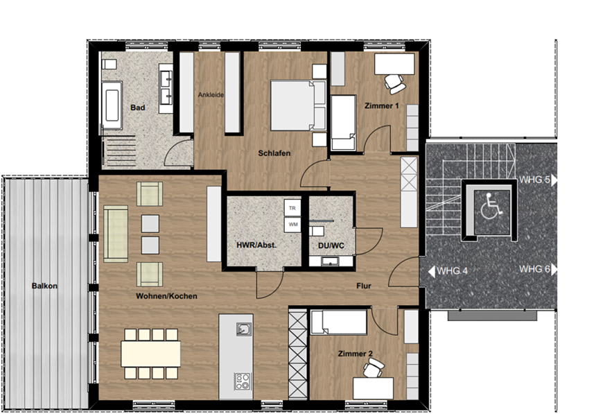 In den vier repräsentativen Häusern finden Sie vielfältige Wohnmöglichkeiten, die jeden Geschmack ansprechen. Erdgeschoss-Wohnungen bieten Terrassen, Obergeschoss-Wohnungen haben Balkone, und die Penthouse-Wohnungen beeindrucken mit Dachterrassen.