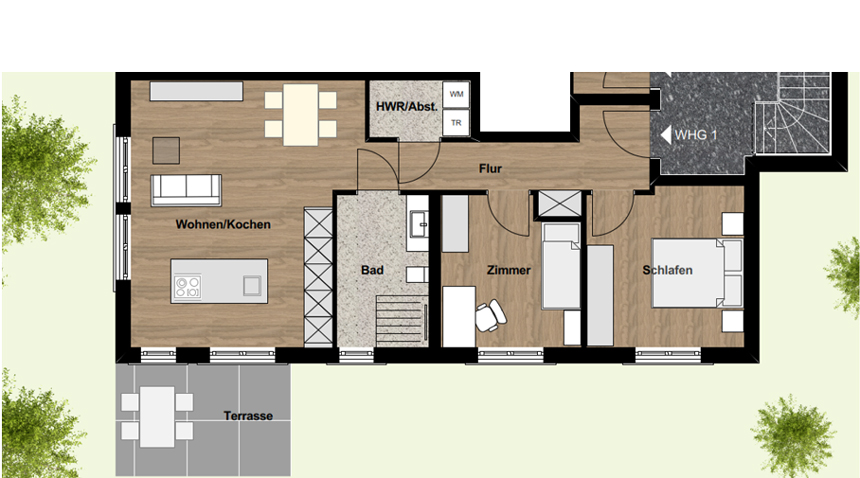 Dargestellte Küchen und Möblierung sind nicht im Leistungsumpfang enthalten.